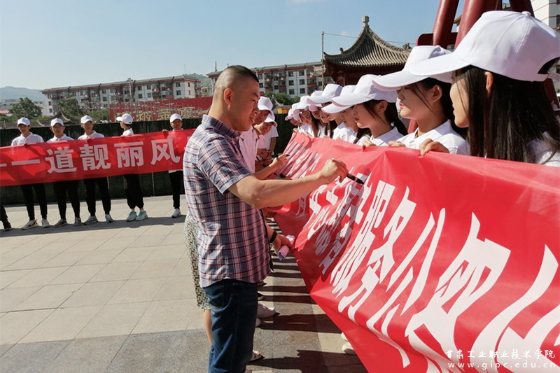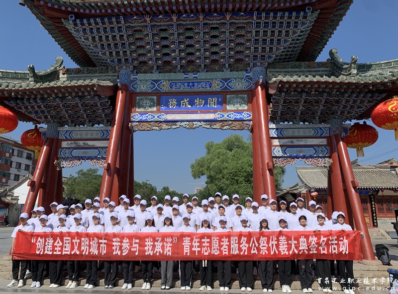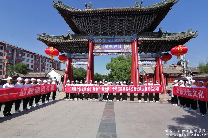 6月15日,由共青团天水市委、天水市学生联合会主办的“创建全国文明城市,我参与、我承诺”青年志愿者服务公祭伏羲大典签名活动在伏羲广场举行,我校百名学生组成的志愿者服务队参与了此次活动。签名仪式由我校团委书记黄晓慧主持。