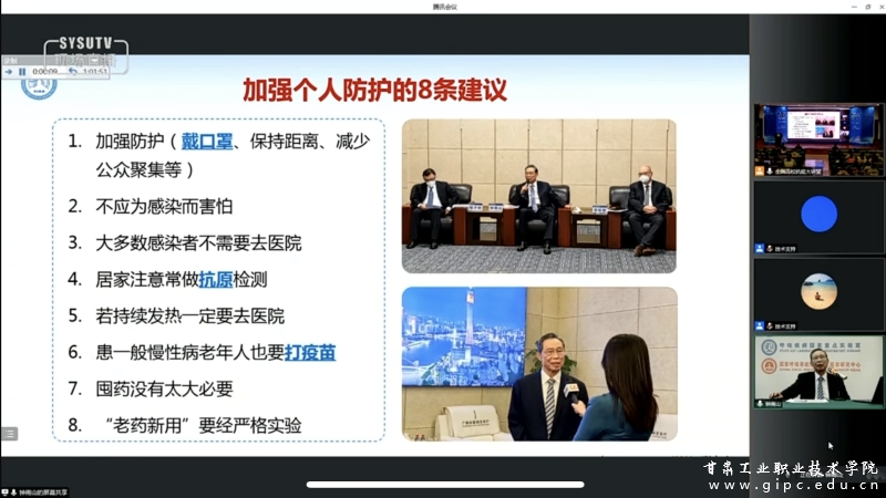 钟南山院士从“两年多以来抗疫取得的成就、全国范围第二波(Omicron)疫情的特点、Omicron的生物学特征和致病性、学生如何在大学教学环境中加强个人防护”四个方面展开,重点讲解了如何科学理性认识奥密克戎病毒,从容应对疫情发展新变化,做个人健康的第一责任人;解读了“新十条”疫情防控措施及如何进一步优化学校疫情防控;深刻阐述了下一步防控的关键措施即加强疫苗接种,并提出加强个人防护的8条建议和青年人应对新冠的4条重要措施。