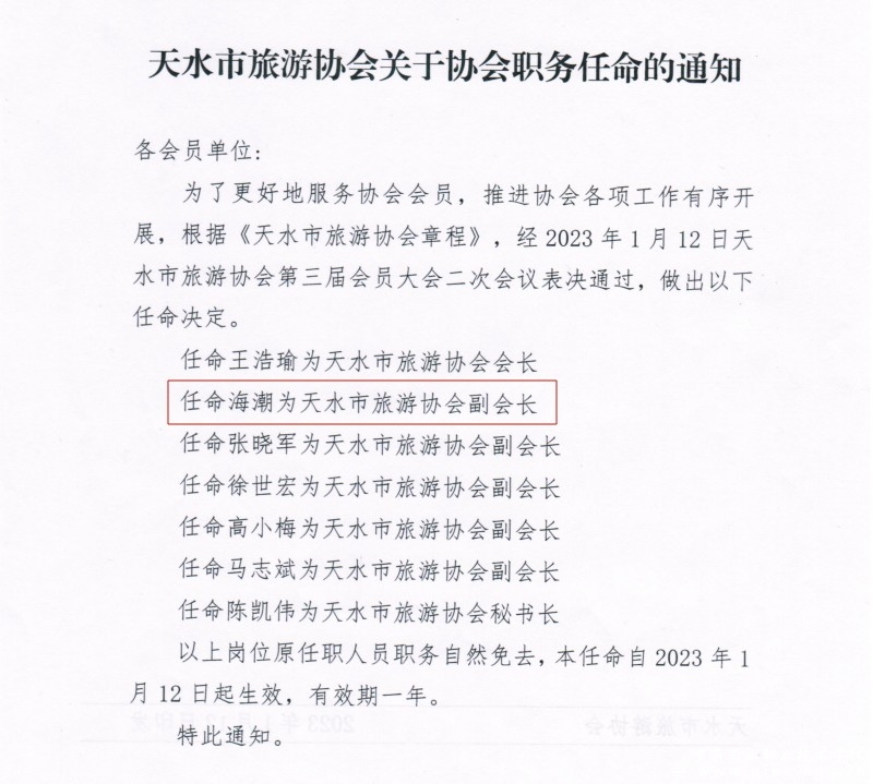 根据天水市旅游协会 《天水市旅游协会关于协会职务任命的通知》(天旅协发〔2023〕3号),我校教师海潮当选天水市旅游协会副会长。