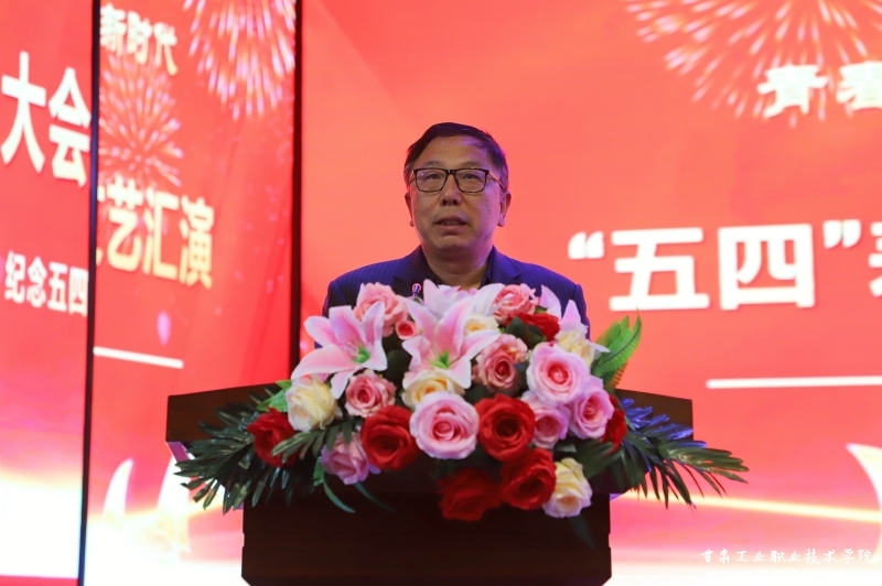 党委书记杨声致辞,代表学校党政向全校广大青年教师、团学干部和青年学生们致以节日的问候,向受到表彰的先进集体和个人表示热烈的祝贺。他指出,近年来学校各级团学组织在党委的领导下,围绕中心、服务大局、积极探索、勇于实践,开展了大量富有成效的工作。广大团员青年在“五四”精神的感召和激励下,恪守“高举团旗跟党走”的政治信念,秉承“崇德精技、乐业修身”的校训,积极投身于学校改革发展的生动实践,创造了无愧于时代的辉煌业绩,同时涌现出许多投身祖国建设的优秀技能人才,树立了“工院骄子”的光辉形象。