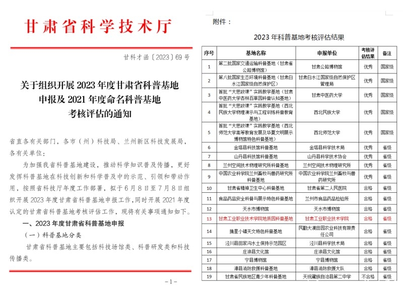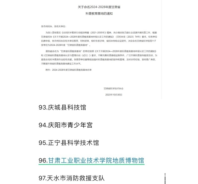 2023年6月,地质博物馆向甘肃省科技厅提交了“甘肃省科普基地”考核材料,通过线上汇报、答辩,顺利通过甘肃省科技厅评定,获得了合格等级。