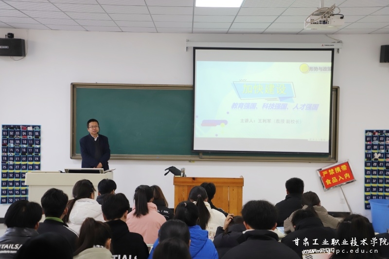 讲到着眼长远发展的重大抉择问题,王利军指出,教育是民族振兴、社会进步的重要基石,是功在当代、利在千秋的德政工程,教育在现代化建设中具有基础性、先导性、全局性作用;科技是国家强盛之基、安全之要,必须加快科技自立自强,走好科技创新这步先手棋;人才是实现民族振兴、赢得竞争主动的战略资源,必须坚持人才引领驱动。讲到铸就强国建设的坚实基础时,他以一系列准确的数据说明了我国教育普及水平实现了历史性跨越,同时对甘肃省和全国数据做了详细对比,充分阐述了教育对人才的支撑作用。并寄语同学们,学好专业技能,勇担民族复兴大任。
