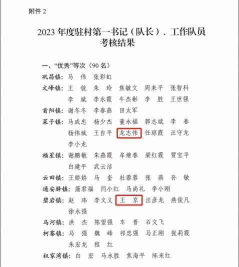 2023年,我校驻陇西县菜子镇和碧岩镇帮扶工作队在驻村工作队考核中荣获优秀,我校驻村帮扶队队员龙志伟、王京荣获优秀个人。