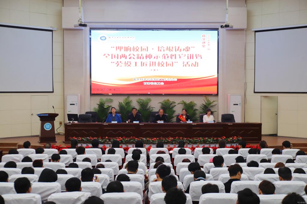 为全面深入学习领会习近平总书记在全国两会期间发表的一系列重要讲话精神以及全国两会审议通过的报告和文件精神,根据省委教育工委、省总工会统一安排,4月24日上午,学校在图书馆智敏学术报告厅举办了“理响校园·培根铸魂”全国两会精神示范性宣讲暨“劳模工匠进校园”活动。党委委员、副院长周晓明出席,校工会、马克思主义学院党总支主要负责人、马克思主义学院教师、“1231”工程学生和各二级学院学生干部及学生代表,共计300余人参加。活动由党委委员、宣传(统战)部部长黄晓慧主持。
