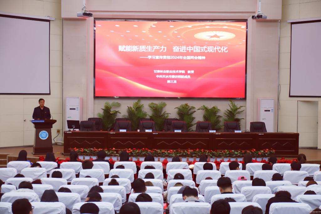 第十二宣讲团组长、马克思主义学院党总支书记郭三龙作了题为“赋能新质生产力 奋进中国式现代化”的报告,从3个方面对全国“两会”精神作了权威精辟、深入浅出地解读,站位高远、主题鲜明、内容丰富,具有很强的理论性、思想性和指导性,对我校师生全面、深入理解和把握全国“两会”精神,并用以指导和推动教育教学、人才培养,具有十分重要的意义。