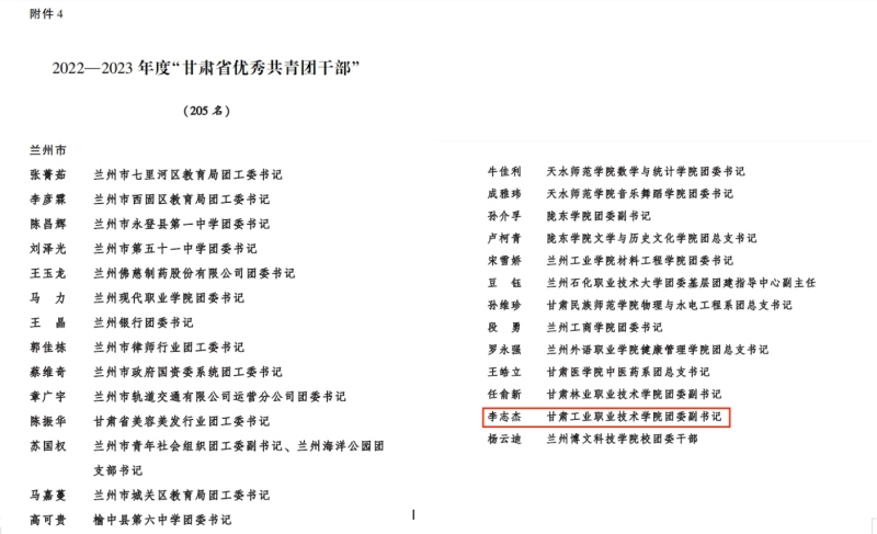 近日,共青团甘肃省委发布了《关于通报表扬2022-2023年度“甘肃省五四红旗团(工)委”“甘肃省五四红旗团支部(总支)”“甘肃省优秀共青团员”“甘肃省优秀共青团干部”的通知》,共青团天水市委发布了《关于通报表扬2023年度天水市五四红旗团委(团支部)、天水市优秀共青团员、天水市优秀共青团干部的决定》,我校团委副书记李志杰荣获“甘肃省优秀共青团干部”称号,校团委荣获“天水市五四红旗团委”称号。