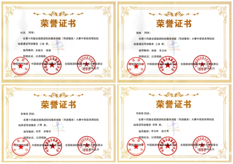 该项赛事是全国旅游院校之间交流的重要平台,是锻炼学生导游岗位能力的重要途径。旅游学院从备赛到参赛,凝心聚力、周密安排,认真打磨每个关键环节和细节,选派出4名学生参赛。经过多轮角逐,旅游管理2331班杜凤,智慧旅游技术应用2331班高峰,旅游管理2332班张瑞佳、司雨雨分获英语组三等奖、优胜奖,我校荣获优秀组织奖。