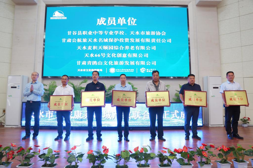 会上,与会领导共同按下启动键,宣布天水市文旅康养市域产教联合体正式成立,并为牵头单位和成员单位授牌。大会还为旅游产品研发中心揭牌,并为文旅康养产业发展智库成员颁发聘书。