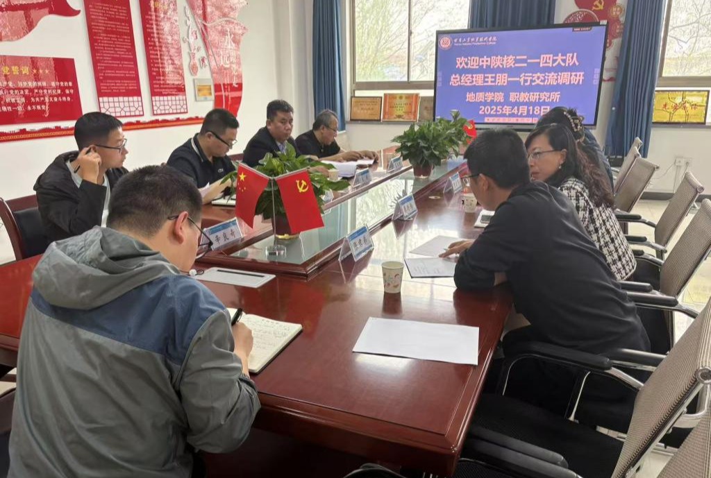 4月18日,中陕核工业二一四大队有限公司总经理王朋—行4人来我校开展校企合作对接交流会暨人才培养方案研讨会,纪委书记、监察专员贾昌麟出席会议,职教研究所、地质学院领导班子、教师代表参加会议。