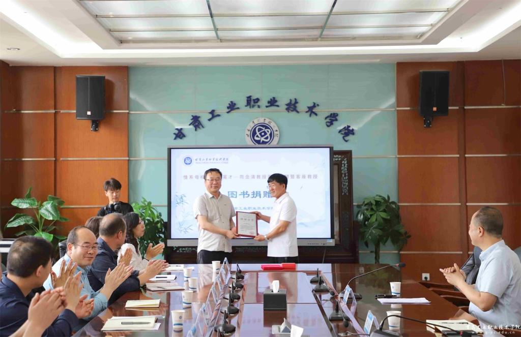 在图书捐赠环节,周念清向母校捐赠涵盖多学科领域的珍贵学术著作。文云代表学校接受赠书并颁发捐赠证书,指出这批图书不仅丰富了我校图书馆的馆藏资源,也为广大师生提供了宝贵的学习资料,进一步促进了学校的学术氛围建设。