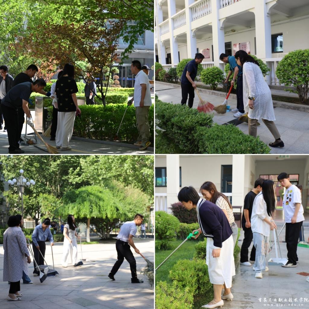 活动中,校领导们拿起扫帚、垃圾钳等工具,分组前往卫生责任区域,与师生一同清理落叶、杂物,擦拭宣传栏、护栏等公共设施。师生们热情高涨、分工协作,有的挥舞扫帚清理落叶,有的蹲下身来拔除杂草,有的提着水桶擦拭栏杆,还有的推着垃圾车来回运送,对教学楼、宿舍区、运动场等公共区域展开“地毯式”清扫。焕然一新的校园环境,为初夏的校园增添了清新活力,更彰显了全体师生共建共享文明校园的坚定决心。