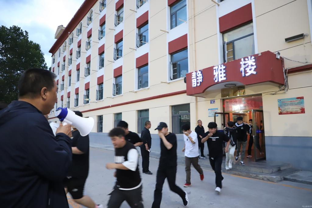 当晚8时,随着火灾警报声响起,演练正式拉开帷幕。公寓内瞬间进入紧张有序的疏散状态。学生们迅速反应,用湿毛巾捂住口鼻,弯腰低姿沿预定路线快速撤离。各楼层负责教师坚守岗位,沉着指挥;安保人员迅速就位,模拟开展灭火救援。整个疏散过程忙而不乱,仅用3分钟,全体师生就安全集结至操场指定区域。各班辅导员立即清点人数,确保不落一人。