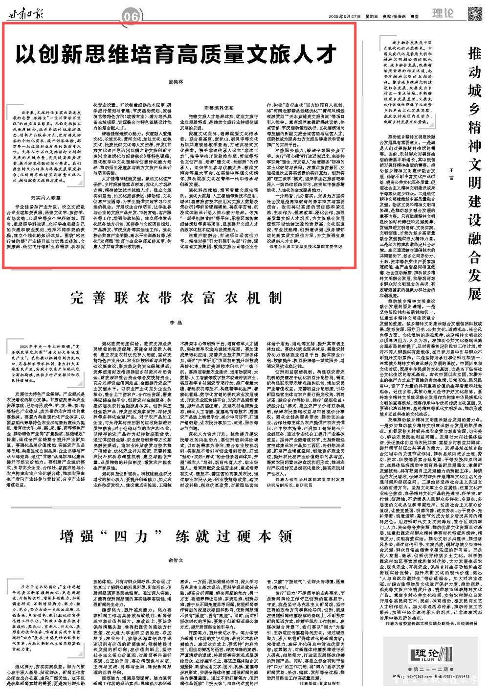 近年来,文旅行业呈现出高速发展的态势,旅游业“一业兴带动百业旺”的效应日益彰显。无论是推动文旅深度融合,还是升级传统旅游业态、创新产品服务方式,更好满足游客的个性化需求、提升游客体验,都需要一批适应行业发展的高质量人才。文旅人才不仅是推动行业创新发展的关键力量,更是提高服务质量、提升游客体验的核心要素。我们要坚持文化传承与旅游发展深度融合,以创新思维培育高质量文旅人才,精准赋能文旅强省建设。