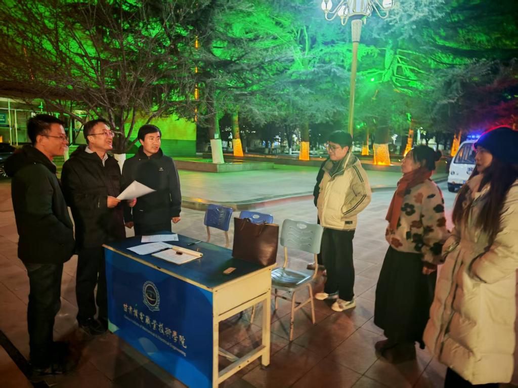 为扎实推进校园安全管理机制落地见效,切实压实学工系统值班值守责任,筑牢校园安全稳定防线,11月21日晚,学校党委书记坚葆林带队检查指导夜间值班工作落实情况。学生处、保卫处、团委相关负责人参加。