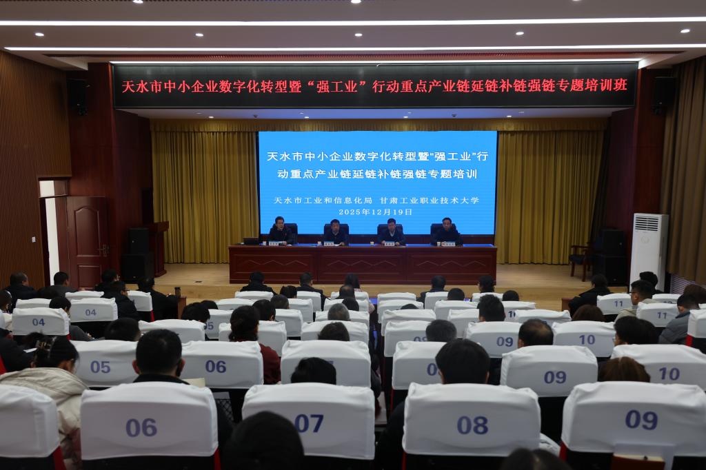 为深入贯彻落实党中央、国务院关于支持中小企业创新发展、加快数字化转型系列决策部署。12月19日,由我校与天水市工业和信息化局共同承办的“天水市中小企业数字化转型暨‘强工业’行动重点产业链延链补链强链专题培训班”顺利开班。全市重点中小企业负责人,市、县区工信部门及经开区经发局相关负责同志100余人参加培训。学校副校长曹惠清出席开班仪式并致辞。