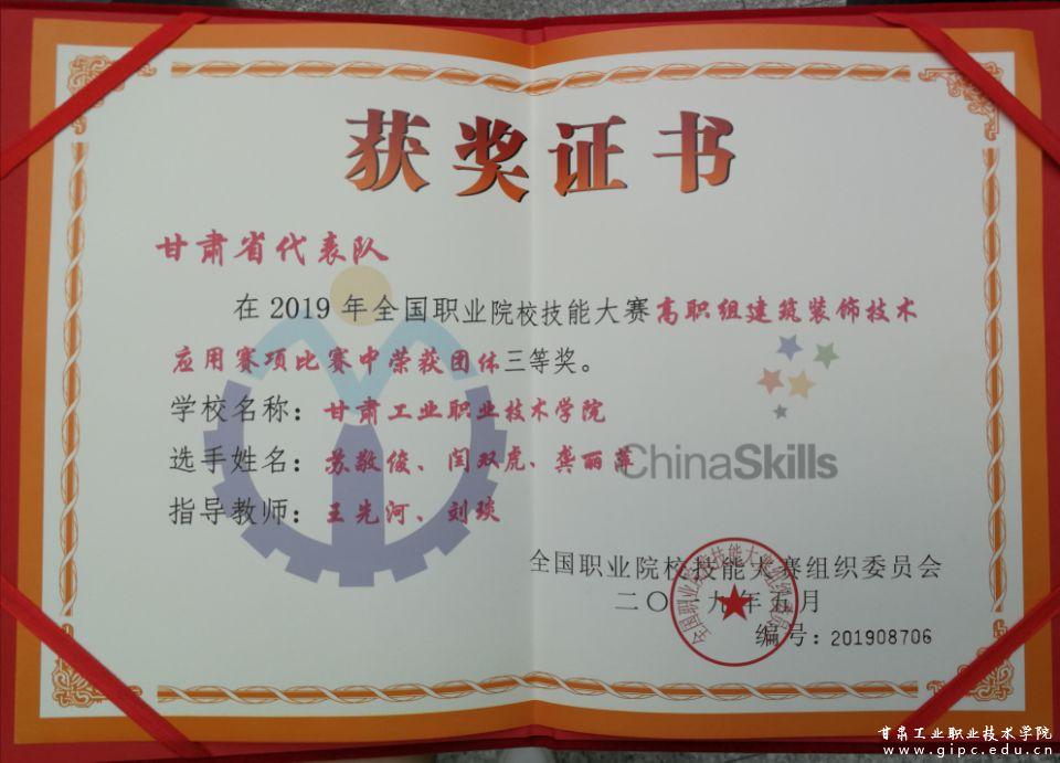 5月31至6月2日,2019年全国职业院校技能大赛高职组建筑装饰技术应用赛项在浙江建设职业技术学院举行。本次大赛为期三天,有来自全国28个省、市、自治区、新疆生产建设兵团的79所参赛院校代表队共计237名选手同台竞技。经过激烈地角逐,我校艺术学院建筑装饰工程技术专业王先河、刘琰老师辅导的苏敬俊、龚丽萍、闫双虎三名学生凭借扎实的专业理论知识、熟练规范的软件技能操作、较强的团队协作能力最终荣获三等奖。