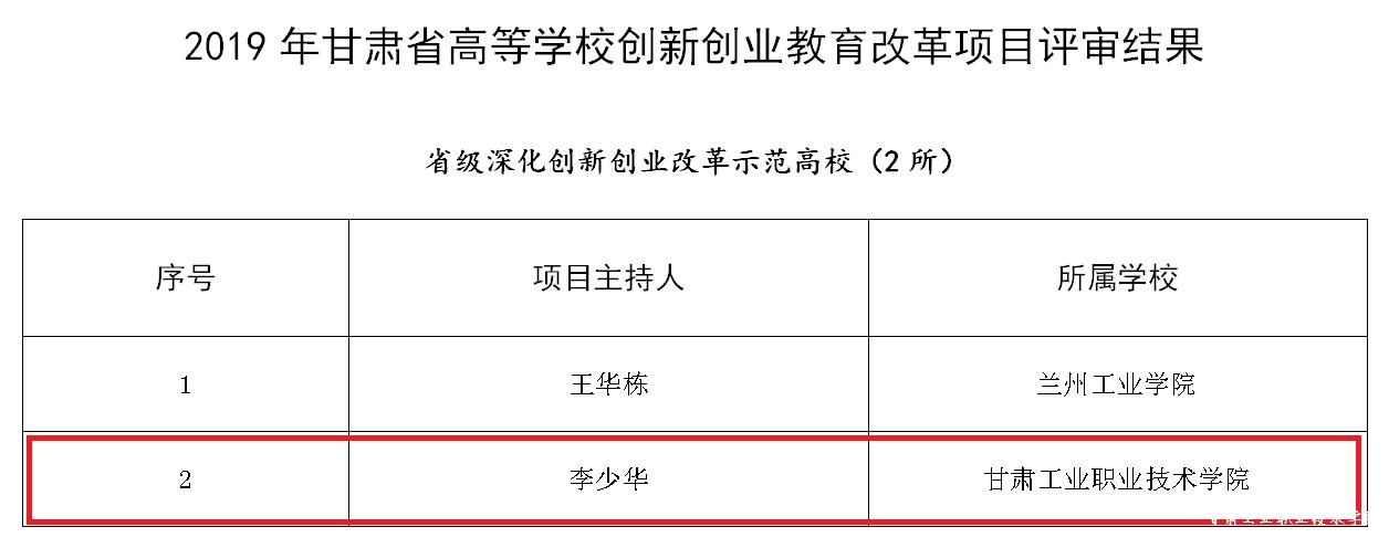 近日,甘肃省教育厅公示关于2019年度高等学校教育质量工程和创新创业教育改革项目的评审结果,我校获批省级深化创新创业改革示范校,成为全省唯一获此殊荣的高职院校。