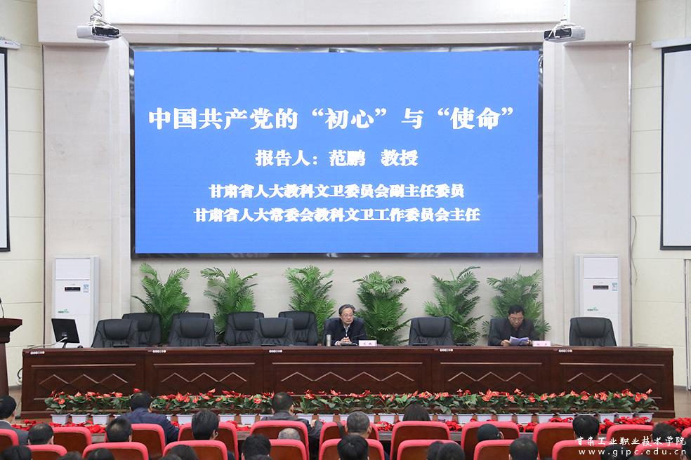范鹏教授结合自己学习、理论研究和甘肃实际,从中国共产党的初心和使命是什么、从何而来、因何而立、如何“守”怎样“担”、在甘肃“守初心、担使命”需要做好的大事等五个方面作了深入系统的讲述。他讲到,中国共产党的“初心”和“使命”就是为中国人民谋幸福、为中华民族谋复兴。我们党的“初心”和“使命”来源于中华民族的“民本”思想与家国情怀,来源于马克思主义的人民观和政党观,来源于中国共产党革命建设和改革开放的伟大实践,来源于习近平总书记对历史大势、政治大局的深刻总结、深入观察与深度思考。共产党人要守好初心、担好使命,就必须学习贯彻好习近平新时代中国特色社会主义思想,锤炼忠诚干净担当的政治品格,为人民幸福和民族振兴而奋斗,贯彻好党中央的决策部署。对于甘肃省而言,就是要认真贯彻落实习近平总书记视察甘肃重要讲话和指示精神,坚决打好打赢脱贫攻坚战;守好生态底线,建设好国家在西部的生态安全屏障;补齐全面建成小康社会的短板,促进高质量发展;在发展中保障和改善民生,维护社会大局稳定;发挥文化资源优势,放大文旅综合效益。范鹏教授强调,甘肃工业职业技术学院作为甘肃一所拥有浑厚底蕴的高职院校,要有文化意识和文化品味,自觉扛起甘肃文化发展的使命,为甘肃高质量的发展做出重要贡献。