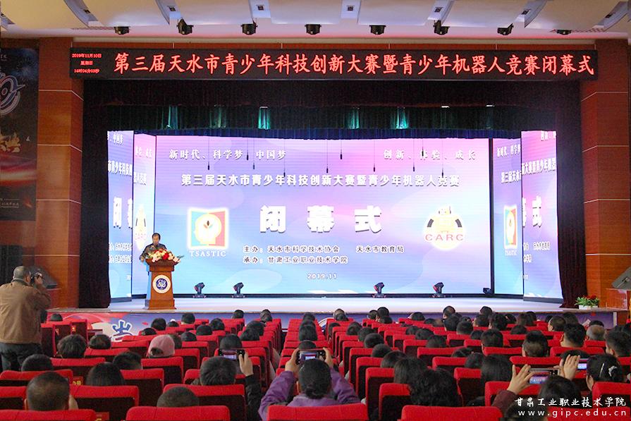 11月10日下午,由天水市科学技术协会、天水市教育局主办,甘肃工业职业技术学院承办的天水市第三届青少年科技创新大赛暨机器人竞赛在学校大学生活动中心圆满落幕。天水市科学技术协会主席伏平、天水市教育局调研员周培烈、天水师范学院副院长王文东、天水一中校长助理胡莜岩、天水市教育局基教科科长董吾衍、甘肃工业职业技术学院党委书记杨声出席闭幕式,天水市科协副主席屈东明主持。