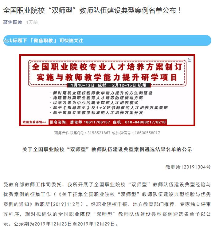 据悉,本次评选活动旨在贯彻落实《中共中央国务院关于全面深化新时代教师队伍建设改革的意见》精神和《国家职业教育改革实施方案》多措并举打造职业教育“双师型”教师队伍的要求,打造一批在全国有影响力、具有示范引领作用的职业教育“双师型”教师队伍建设典型经验和优秀案例,进一步推进职业教育教师队伍管理制度建设及教师素质和教育教学质量提升。