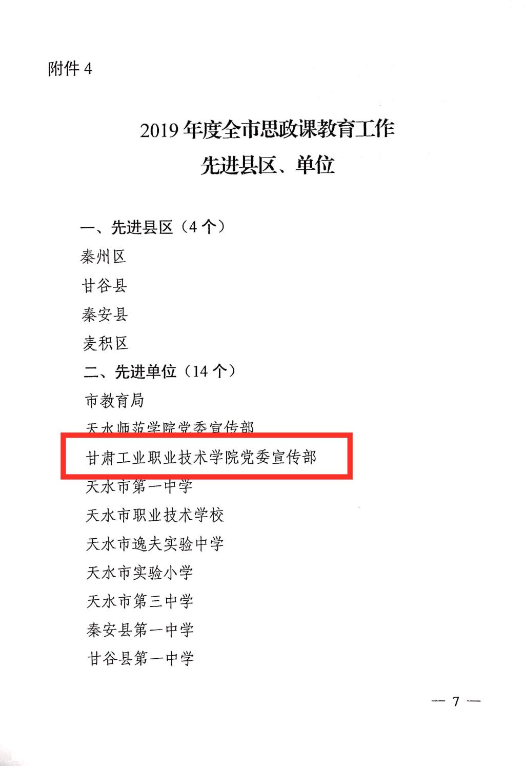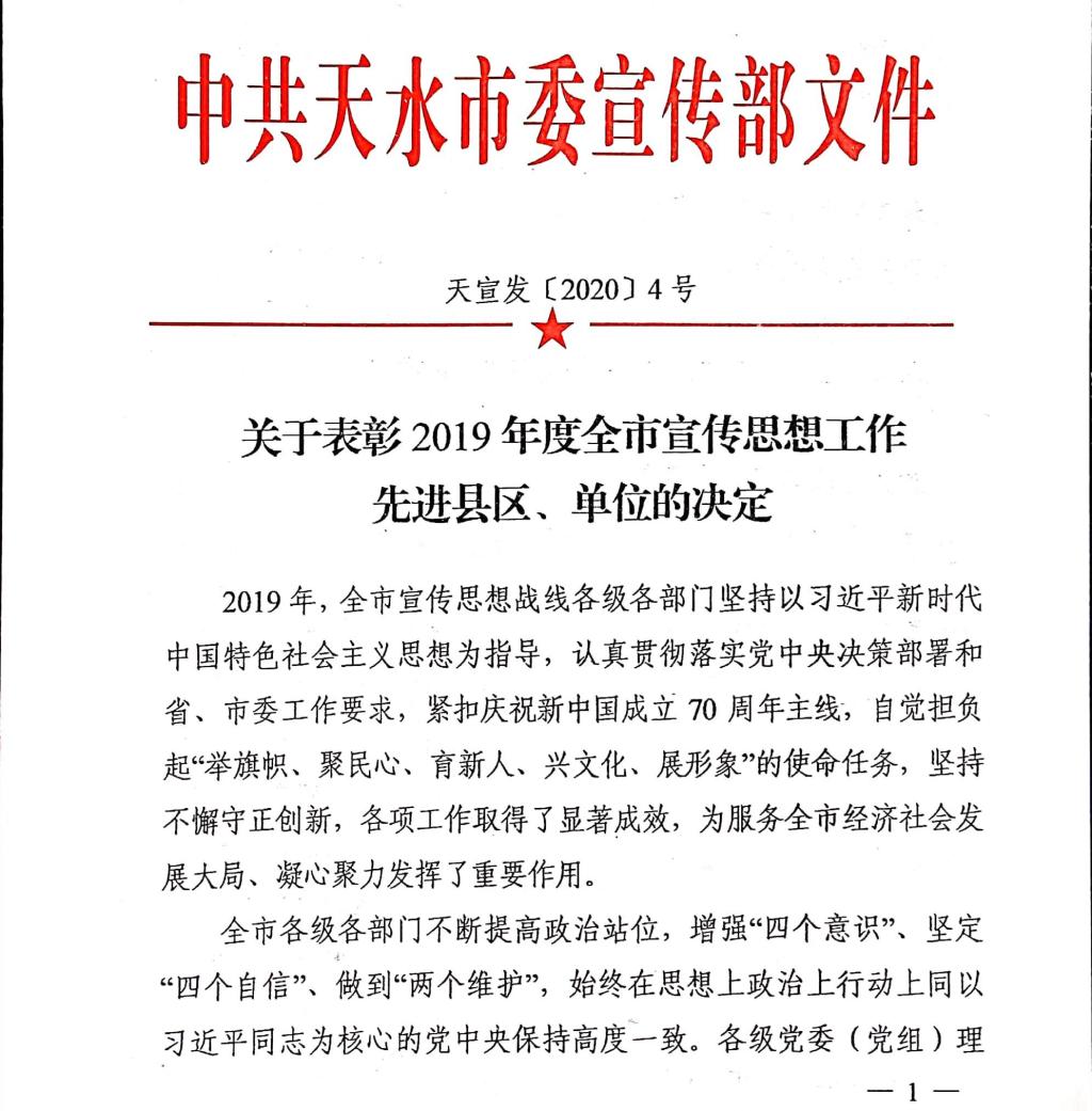 3月13日,2019年度天水市宣传思想工作会议召开,会上表彰了2019年度天水市宣传思想工作先进县区、单位的决定。我校荣获“2019年度天水市宣传思想工作先进单位荣誉称号。