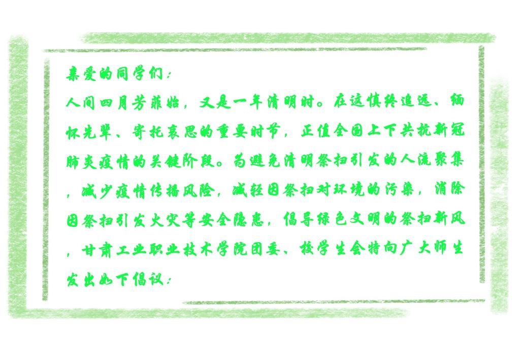 清明将至,在疫情防控的特殊时期,由校团委、学生会发起的“缅怀革命先烈、倡导文明新风”倡议及云祭奠先烈活动,旨在让全体学生自觉摒弃不文明的祭祀行为,做文明祭祀的践行者、宣传者,并通过“云祭奠”扫码浏览我省爱国主义教育基地,缅怀革命先烈,做英烈精神的传承者。 “缅怀革命先烈、倡导文明新风”倡议书 (供稿:校团委 摄像:校团委 编辑:万腾飞 编审:胡森林)