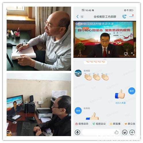 4月15日下午,全校教职工通过钉钉网络直播平台,观看聆听了由校党委书记杨声教授、校长曹爱明研究员所做“践行初心担使命、聚焦思政抗疫情”为主题的课程思政专题网络讲座。
