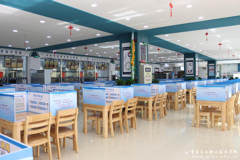 食堂为同学们准备了干净可口的饭菜,同学们通过身份核验、测量体温、洗手消毒后,就可以按要求间隔一米以上排队点餐,一人一桌按标识就坐用餐。