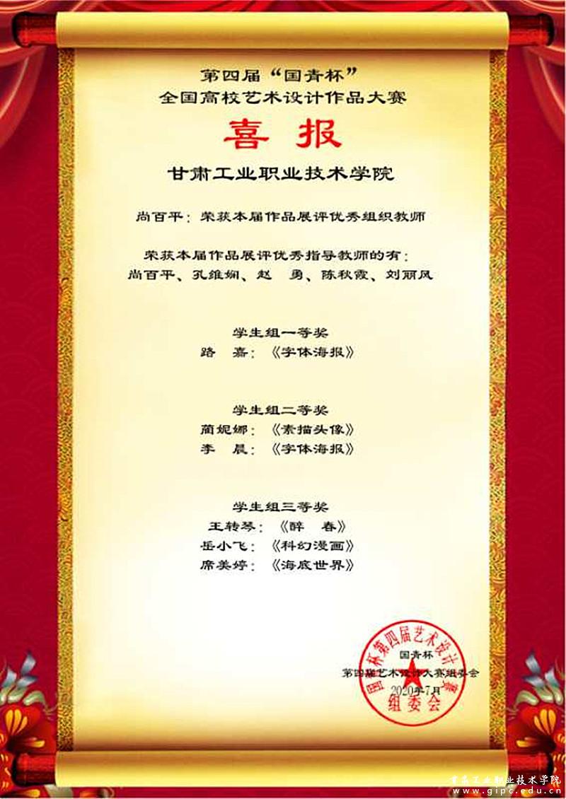 为贯彻落实党的十九大精神,深化高等教育改革,推动高等教育内涵式发展,加大国内外艺术与设计人才的交流合作,探索高等学校艺术与设计师生的发展方向,中国人生科学学会艺术与设计教育学会举办了第四届“国青杯”全国高校艺术与设计作品大赛。大赛期间,我校艺术学院积极组织,师生创作热情高涨,经过长达两周实践的线上线下创作,遴选出原创作品18件参加第四届“国青杯”全国高校艺术与设计作品展。经过专家评选,我校学生组荣获一等奖1项、二等奖2项、三等奖3项,5名教师荣获优秀指导奖,获奖设计作品将在中国人生科学学会艺术与设计教育分会官网上分批分次展示。