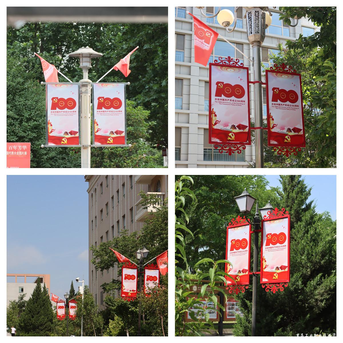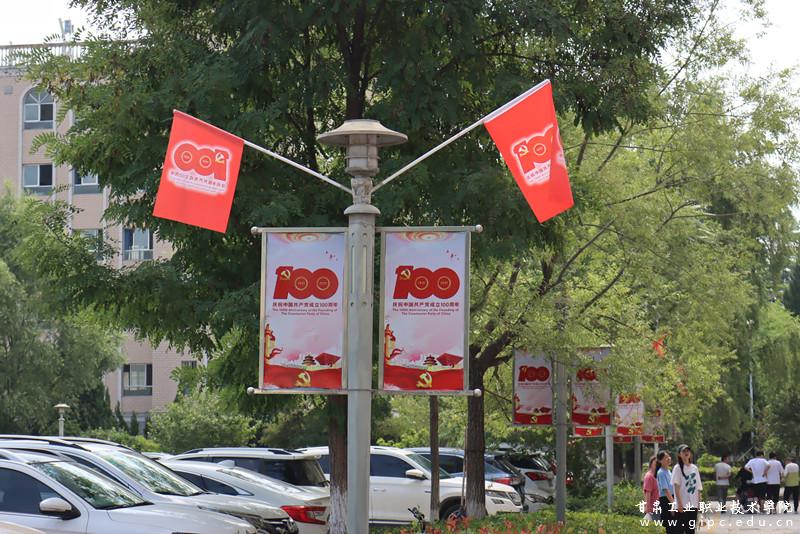学校主干道的路牌上竖起近百面庆祝建党百年旗帜,鲜红的旗帜迎风飘扬,召示着强的国、富的家、和谐的社会和百姓的安康。