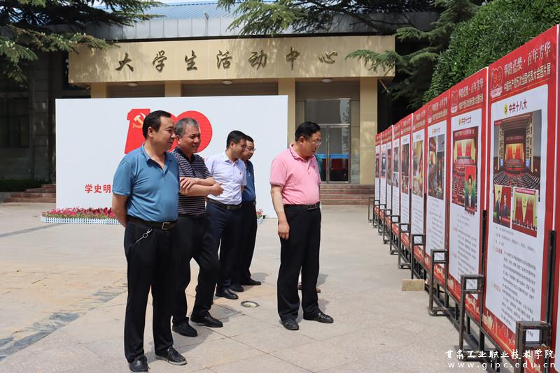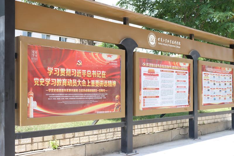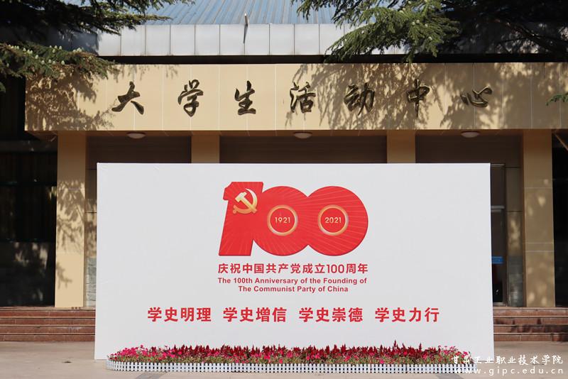 在大学生活动中心前,有22块宣传板十分醒目。庆祝中国共产党成立100周年的活动标识及内容解读让人心生肃穆,图文并茂的中国共产党历次代表大会的简介和党领导下取得的社会主义建设的伟大成就让人激动、自豪。行者驻足、观者深思,中国共产党的百年历程,就是团结带领人民为实现中华民族伟大复兴而接续奋斗的历程。