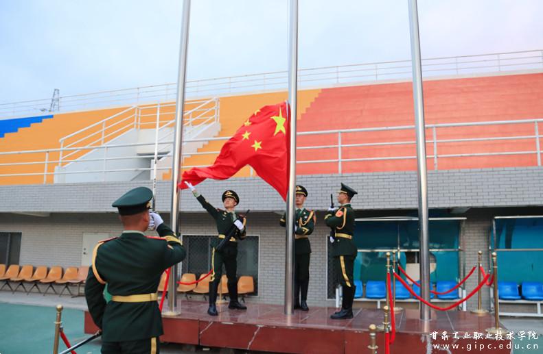 迎着曙光,升旗仪式正式开始,国旗护卫队升旗手高高扬起国旗,鲜艳的五星红旗在庄严的国歌声中冉冉升起,全场师生精神抖擞、庄严肃立,向国旗行注目礼。