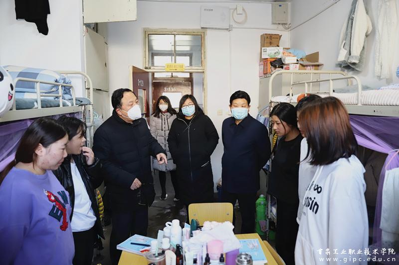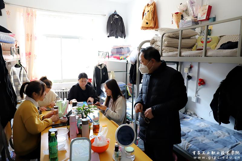 杨声一行先后深入学生1、2、3号公寓,现场检查了学生宿舍、浴室、卫生间等公共区域的消杀情况,并随机走访学生宿舍,与同学们面对面交流,详细了解同学们的日常生活和线上学习情况。