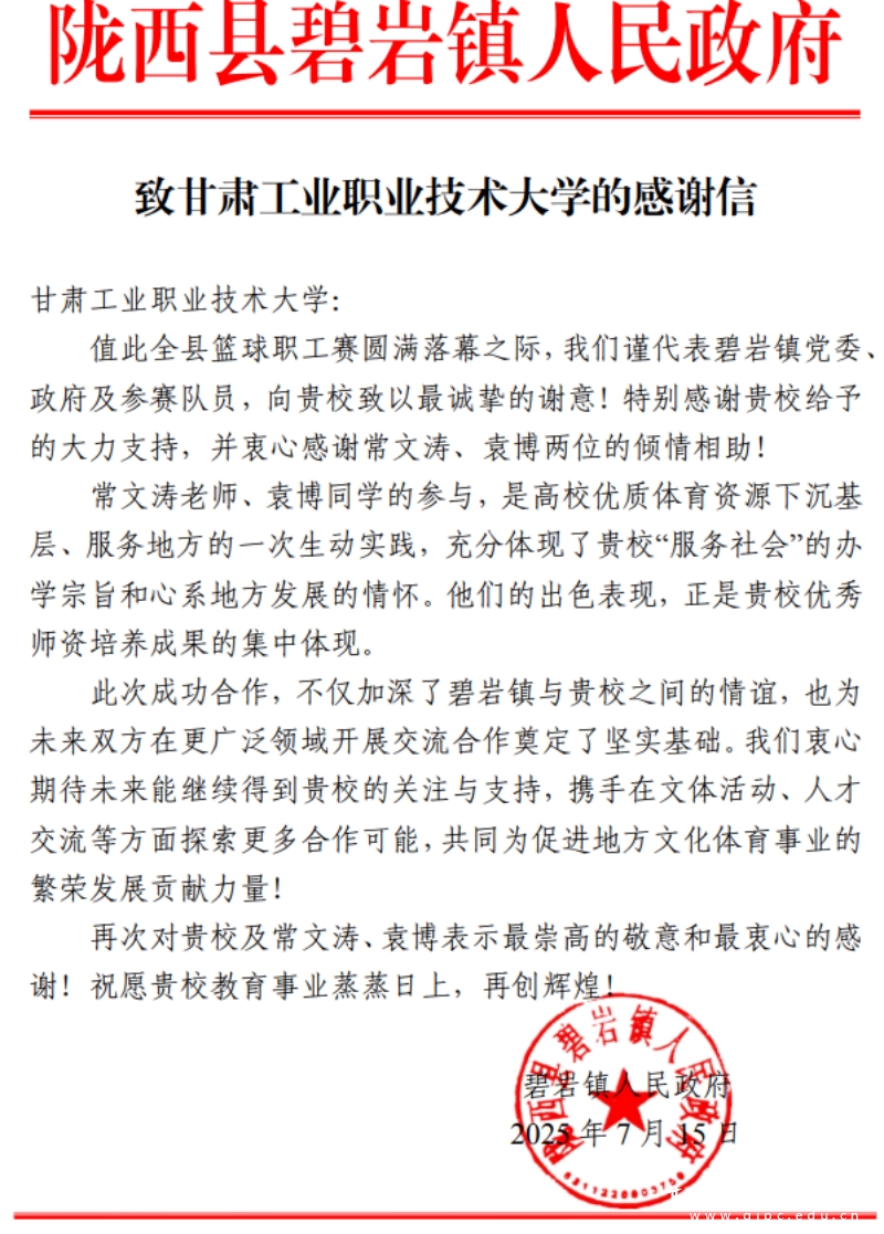 碧岩镇人民政府在感谢信中对学校及常文涛老师、袁博同学表达了崇高的敬意和衷心的感谢。信中提到,这次合作不仅为本次篮球职工赛增添了光彩,更为未来双方在文体活动、人才交流等更广泛领域开展合作奠定了坚实基础。