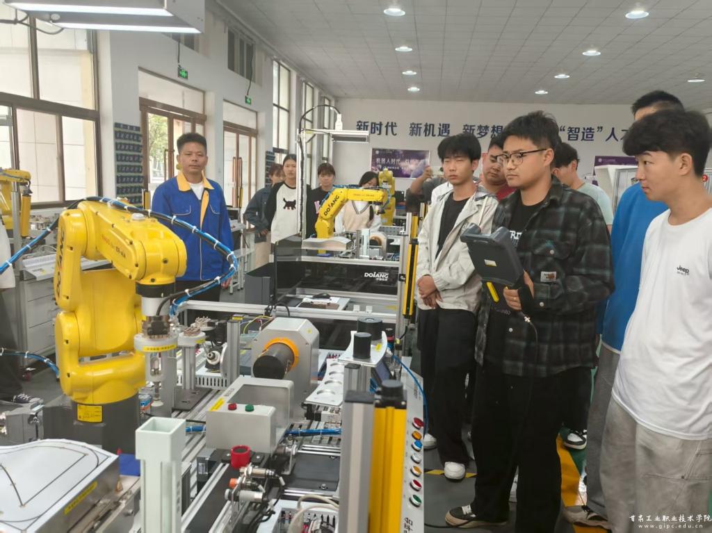 “现场观摩+互动体验”环节是活动一大亮点。六大专业全面开放专业实训室,并联动合作企业搭建实践平台,让新生“零距离”接触专业设备与生产场景。在工业机器人技术实训室,新生们在教师指导下操作机器人手臂完成抓取、摆放动作,直观感受编程指令与机械运动的精准关联;无人机应用技术专业在操场开展无人机编队飞行、垂直起降表演,还邀请感兴趣的新生亲手试飞,让大家在沉浸式体验中感受专业实践的独特魅力。