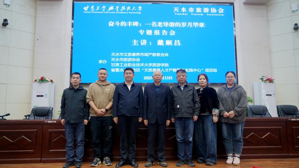 10月13日,由天水市文旅康养市域产教联合体、天水市旅游协会、甘肃工业职业技术大学旅游学院、省重点人才项目“文旅康养人才产教融合实践中心”项目组共同承办的“奋斗的丰碑:一名老导游的岁月华章”专题报告会在学校智敏报告厅举行。天水市旅游协会会长、天水旅游培训中心主任王浩瑜,社会导游代表以及旅游学院在家班子成员出席活动,旅游学院全体师生参加。