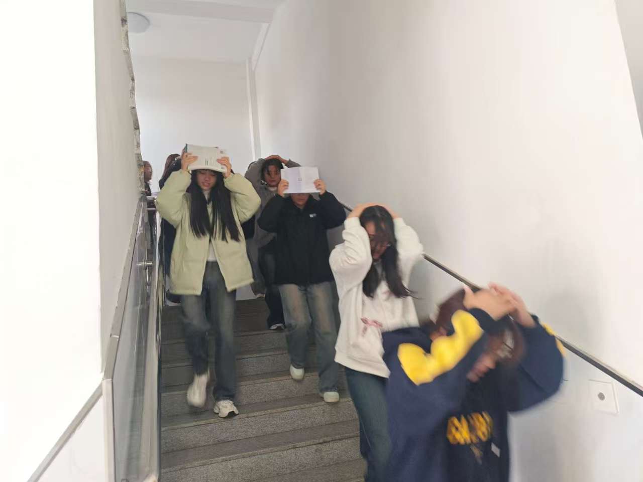 随着演练提示响起,学生们迅速蹲下,双手抱头或用书本等遮住头部,依靠桌子掩护,在辅导员和班主任指挥下,迅速有序地从楼梯进行紧急疏散,用最快的时间“撤离”教室和宿舍,前往学院指定的“安全地带”。整个过程紧张规范有序,教学楼和宿舍楼梯口都安排有老师维持秩序,全院学生两个场景全部疏散完毕分别用时2分33秒(教室)和3分52秒(宿舍)。