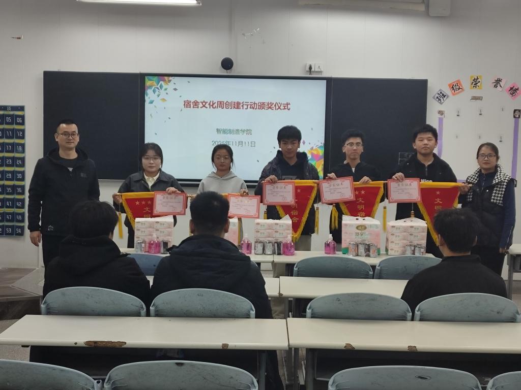 在全校宿舍卫生评比周期间,智能制造学院积极响应学校号召,精心组织开展院级宿舍卫生评比活动。11月11日,学院顺利举办文明宿舍颁奖仪式,集中表彰了一批表现突出的优秀宿舍。
