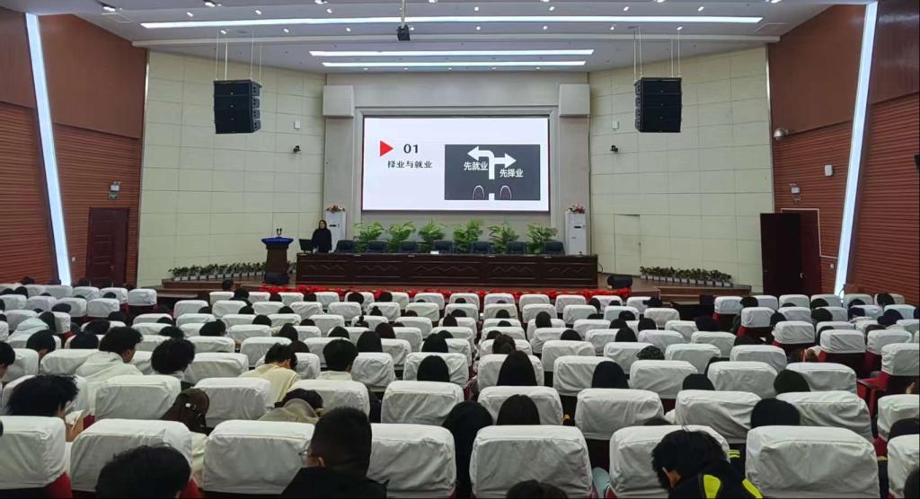 刘旭以“如何走好职场第一步”为主题,从五个方面为学生系统梳理了求职要点:一是精准选择企业,引导学生结合自身特点理性择业;二是科学匹配岗位,帮助找准职业起跑点;三是掌握面试技巧,提升综合应对能力;四是规划职业路径,明晰成长阶梯;五是塑造积极心态,从容迎接职场挑战。