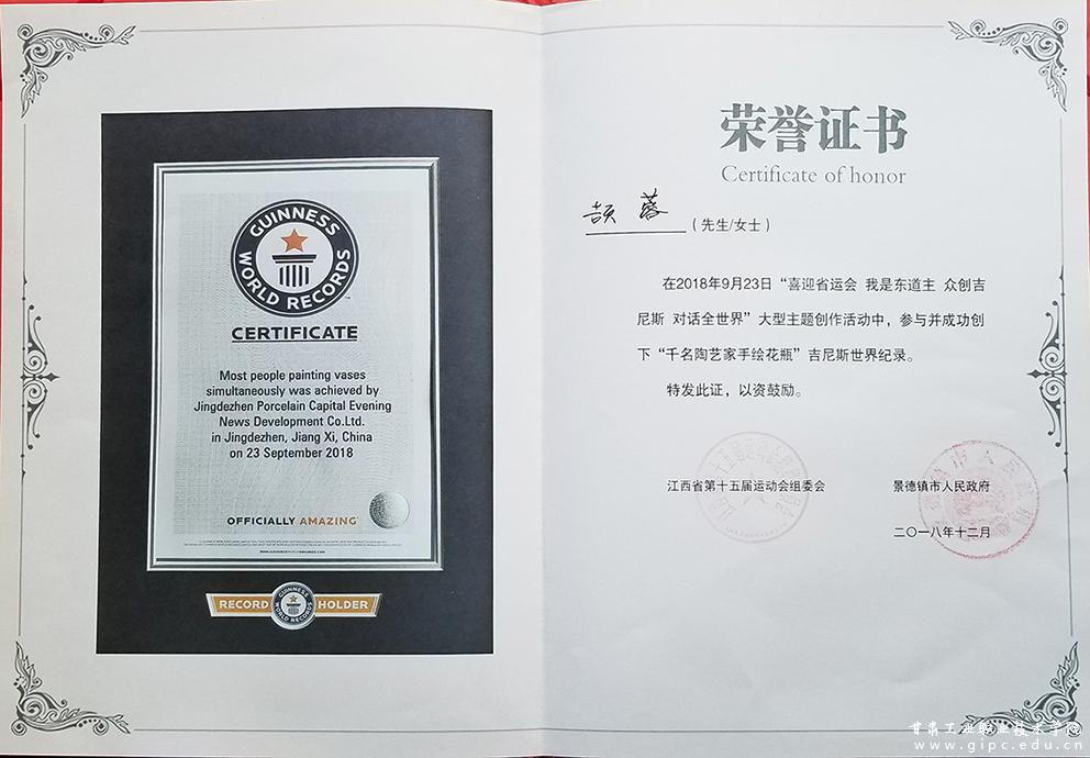 我校艺术学院工艺美术品设计专业颉蓉副教授,于2018年9月23日在江西省景德镇市“喜迎省运会 我是东道主 众创吉尼斯 对话全世界”大型主题创作活动中,参与并成功创下“千名陶艺家手绘花瓶”吉尼斯世界纪录。