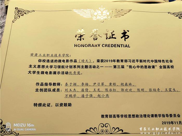 2019年教育部习近平新时代中国特色社会主义思想大学习领航计划系列主题活动之一——第三届“我心中的思政课”全国高校大学生微电影展示活动,我校报送的微电影作品《晴天》荣获优秀奖。