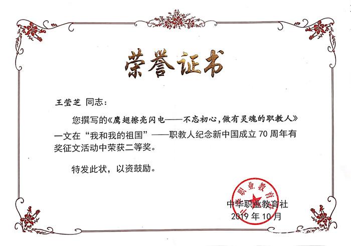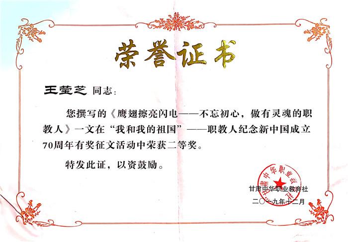 日前,中华职业教育社公布了获奖集体及个人,我校教师王莹芝撰写的《鹰翅擦亮闪电——不忘初心,做有灵魂的职教人》一文在此次征文活动中分别获得甘肃中华职业教育社二等奖、中华职业教育社二等奖的荣誉。