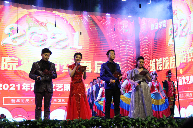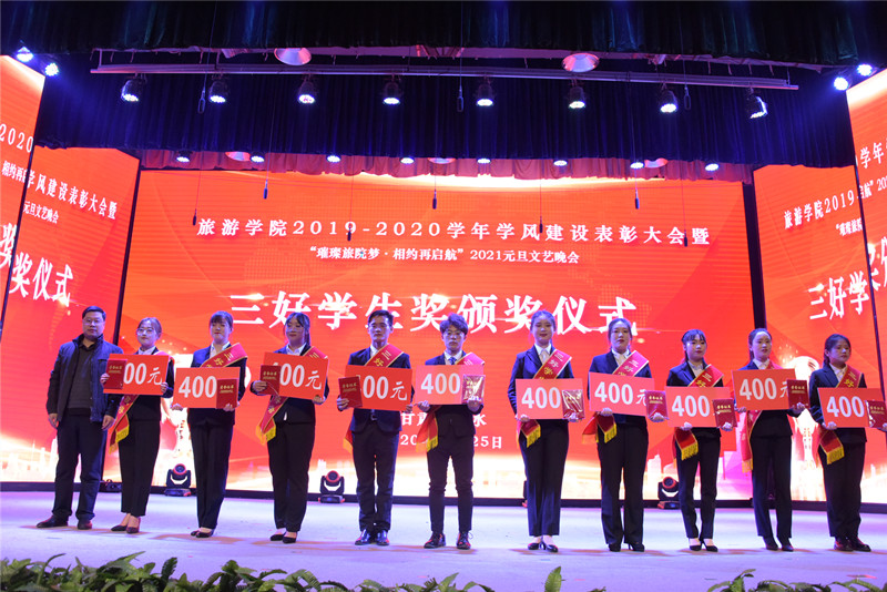 12月25日晚,旅游学院学风建设表彰大会暨“璀璨旅院梦·相约再启航”2021年元旦文艺晚会在大学生活动中心隆重举行。副院长李玉生、组织人事部部长杨建国、宣传统战部部长胡森林、教务处处长何瑛、学工处处长曹惠清、团委书记黄晓慧、旅院学院院长曹瑞琴与800余名师生欢聚一堂。
