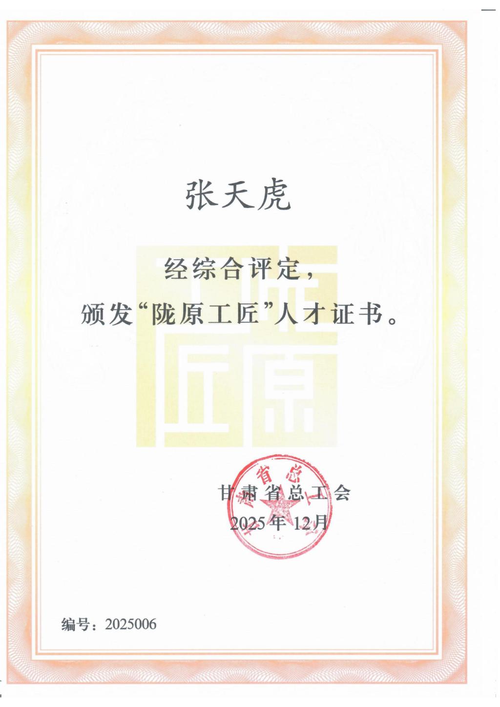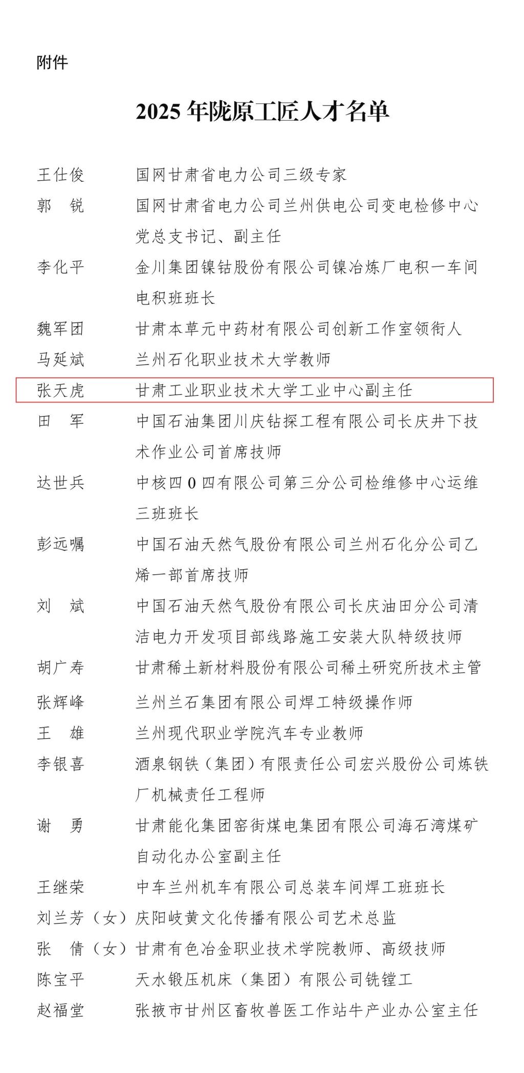 近日,从全省深化产业工人队伍建设改革推进会暨重点产业链联盟现场观摩会上传来捷报——2025年度“陇原工匠”人才名单正式发布!本次评选共产生20名优秀高技能人才,覆盖冶金机械、电力能源、新材料等多个重点领域。我校教师张天虎凭借精湛的技能水平、突出的专业贡献和深厚的职业素养成功入选,彰显了我校在高水平“双师型”教师培养上的显著成效。