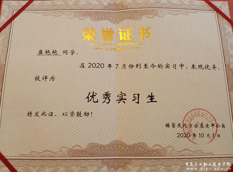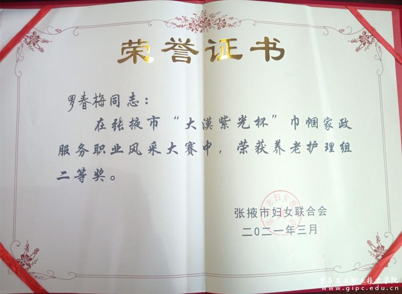 2018级老年服务与管理专业学生罗春梅代表实习单位在张掖市“大漠紫光杯”巾帼家政服务职业风采大赛中荣获养老护理组二等奖;崔艳艳、武金弟被实习单位椿萱茂北京亦庄老年公寓评为优秀实习生;扎玉美因工作认真负责、忠于职守,被实习单位南通阳光护理院颁发救人一命奖;郭奔华、路亚梅、后素瑞、唐小娟、李淑峰、梁红强、包耀强7名同学因工作出色表现、贡献突出被用人单位列为重点培养对象。