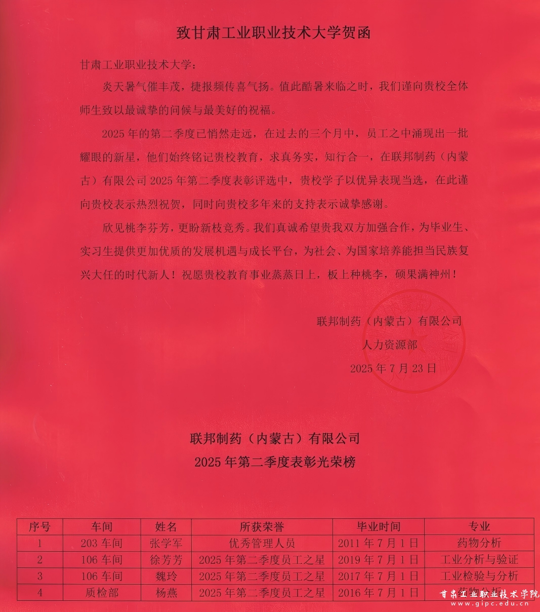 近日,我校化工学院荣幸地收到了来自联邦制药(内蒙古)有限公司的贺信。2011届毕业生张学军同学荣获“优秀管理人员”称号;2016届毕业生杨燕、2017届毕业生魏玲以及2019届毕业生徐芳芳等三名同学,荣获“2025年第二季度员工之星”称号。