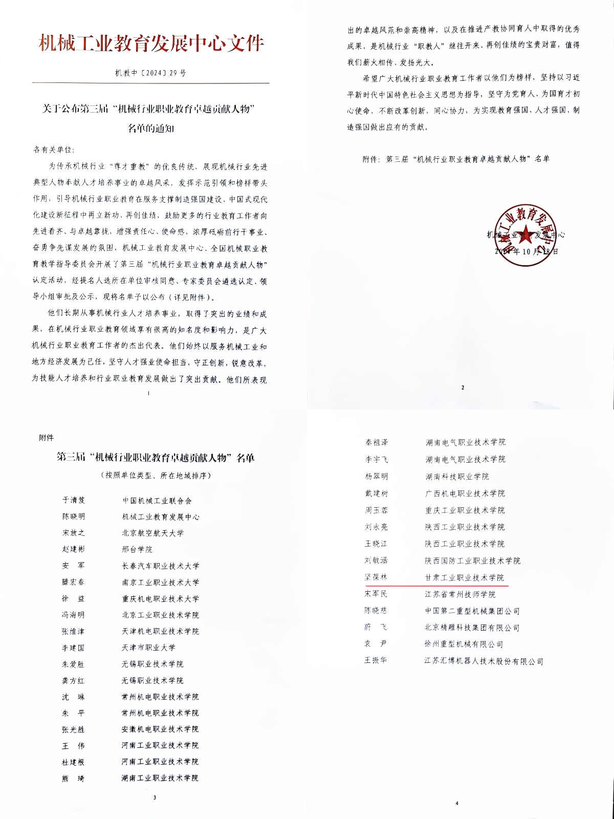 喜报!我校党委书记坚葆林荣获机械行业职业教育卓越贡献人物