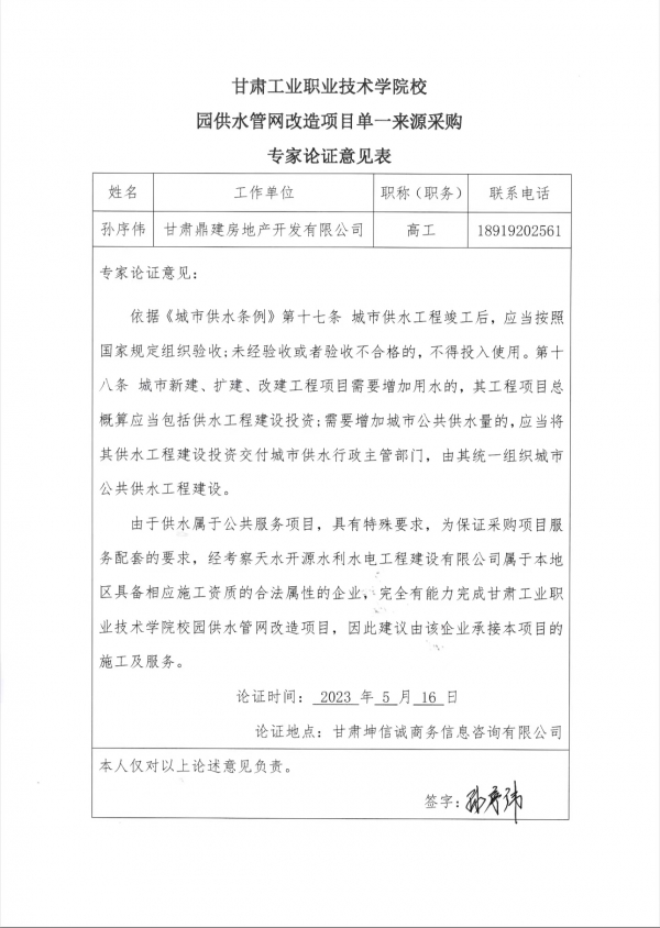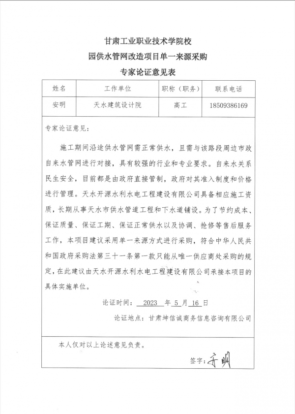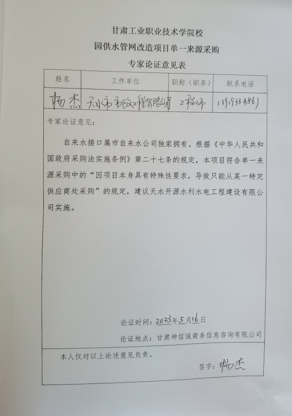 甘肃工业职业技术学院校园供水管网改造项目单一来源公示